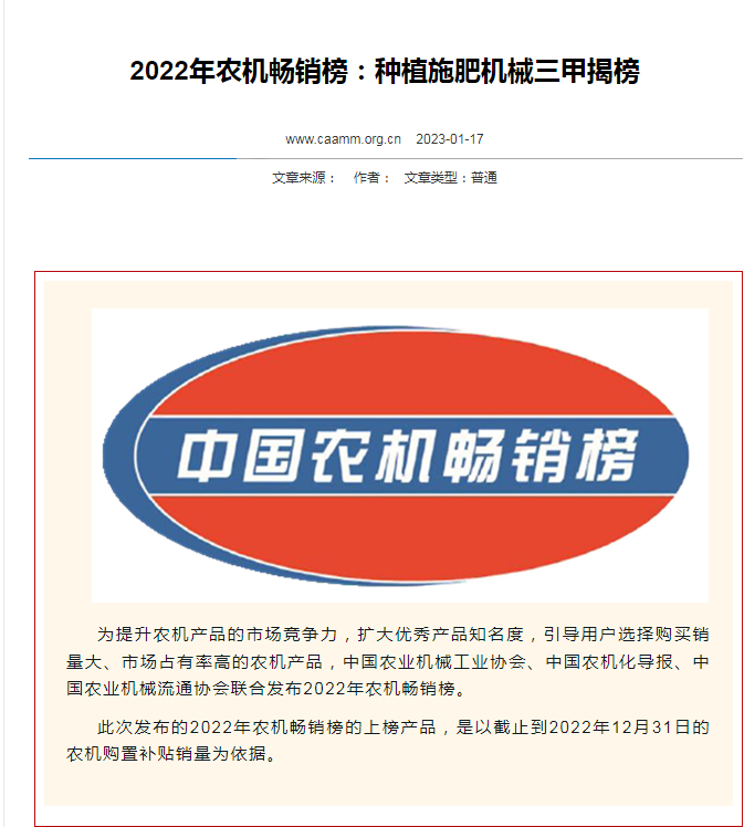 亞澳農(nóng)機榮獲2022年耕整地機械和 種植施肥機械農(nóng)機暢銷三甲榜