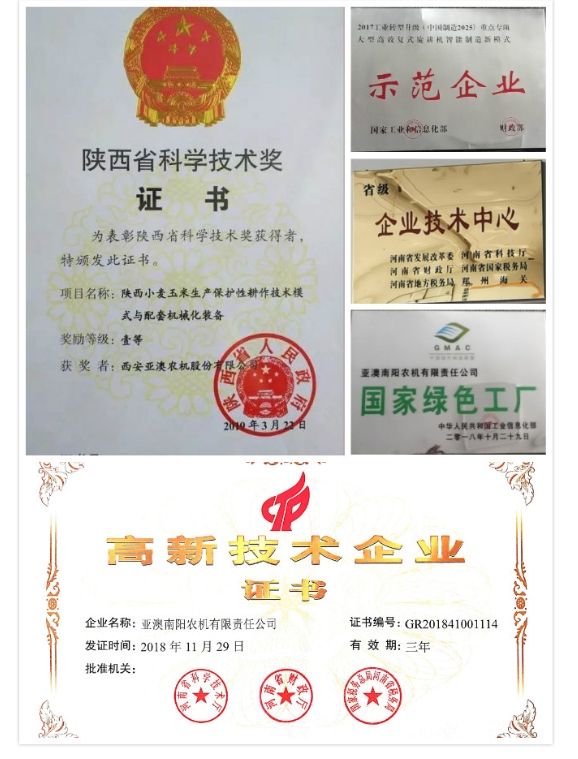 亞澳農(nóng)機堅持“產(chǎn)品就是人品、內(nèi)在是我心、外在是我臉”的品質(zhì)原則,多功能變速旋耕機、旋播施肥機、聯(lián)合耕整機、雙軸滅茬機、精量免耕播種機、深松機等產(chǎn)品在耕整機械(主機配套40-300馬力)領(lǐng)域處于行業(yè)前列, 累計取得自主專利78項。2018年“亞澳”商標獲得中國馳名商標,產(chǎn)品多次被中國農(nóng)機化協(xié)會、中國農(nóng)業(yè)機械流通協(xié)會、中國農(nóng)業(yè)機械工業(yè)協(xié)會授予“AAA級信用企業(yè)”、“技術(shù)進步獎”、“產(chǎn)品創(chuàng)新獎”、“全國農(nóng)機用戶滿意品牌”、“最具影響力品牌”,被國家相關(guān)部委單位授予農(nóng)業(yè)部科技進步三等獎、星火計劃金獎、西安市科技進步一等獎、陜西省行業(yè)之星企業(yè),“專精特新”中小企業(yè),南陽市級科技百強企業(yè)等多項殊榮;國家型高新技術(shù)企業(yè),在農(nóng)機行業(yè)中具有較高的美譽和知名度,得到了社會的廣泛認可。