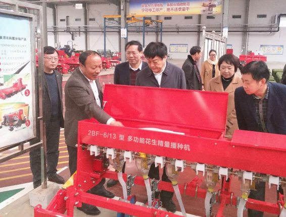參觀過程中,劉樹華部長親切的向郭總咨詢公司的產(chǎn)品,郭總向劉樹華部長簡述了2BF-6/13 多功能花生精量播種機的功能構(gòu)造,在得知該款機型當(dāng)年投產(chǎn)當(dāng)年熱銷后,劉部長十分高興的對郭總說:“亞澳要進(jìn)一步開展科技研發(fā)工作,多培養(yǎng)、招聘科研人員,增強自身科研力量,成為農(nóng)機具行業(yè)的標(biāo)桿”,周天龍縣長對劉樹華部長說:“縣政府已批給亞澳30多畝土地,作為亞澳的科技研發(fā)中心”。